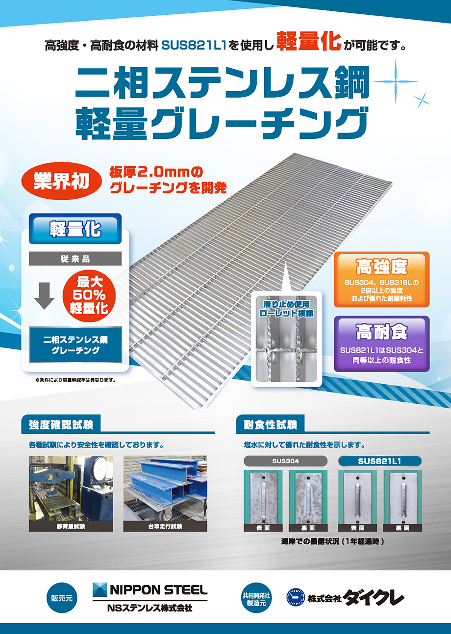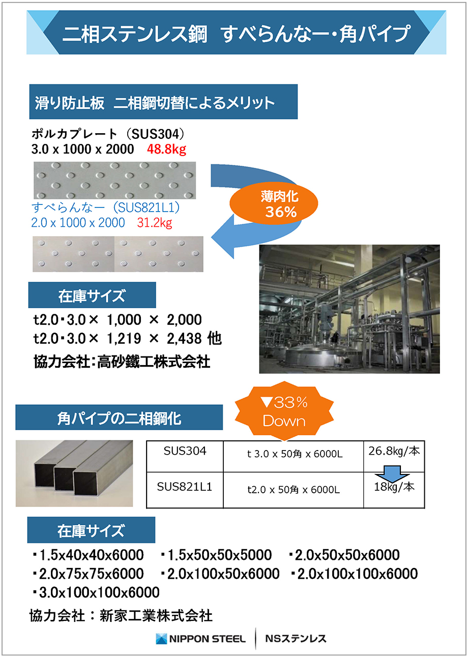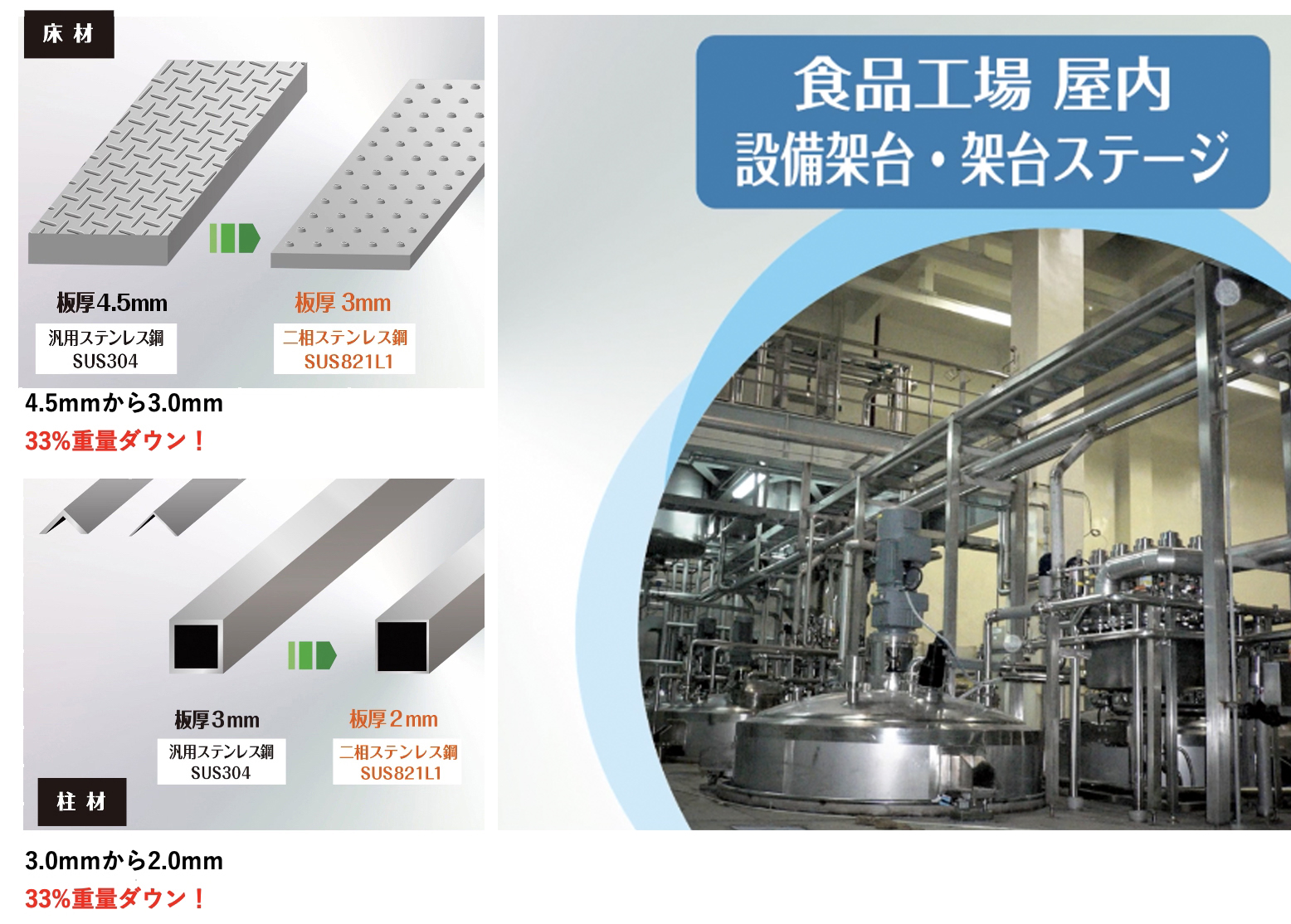【ソリューション】高強度な二相ステンレス鋼による床板、柱、梁の薄肉軽量化を提案